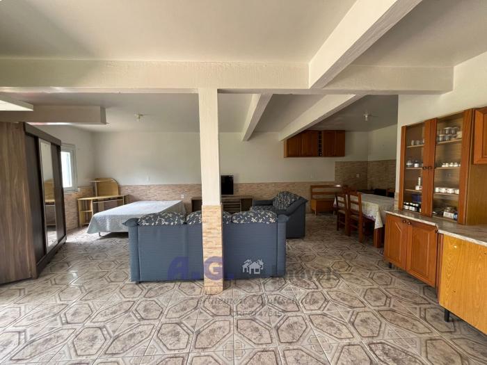 Casa construída em estilo tradicional, com telhado aparente, na sua distribuição com ambientes espaçosos e um terreno com grande extensão.