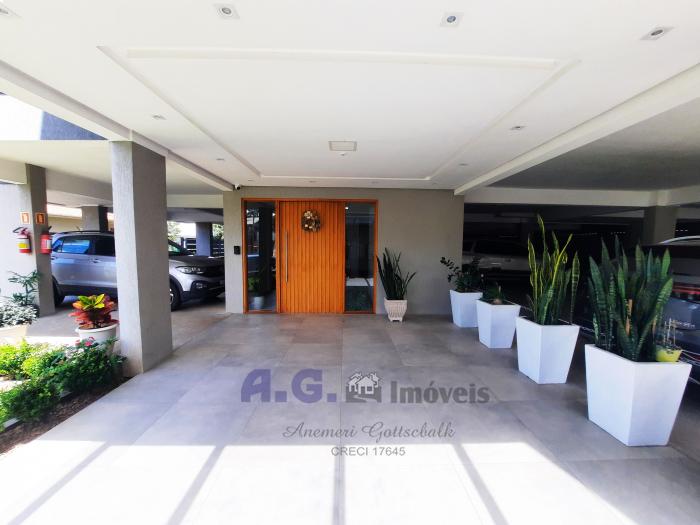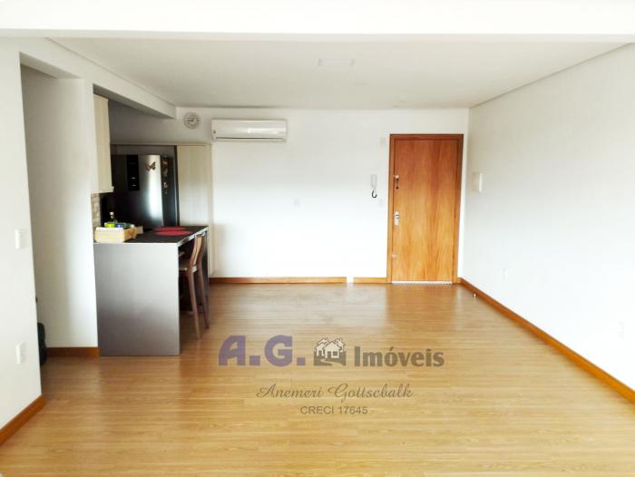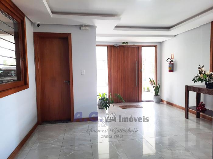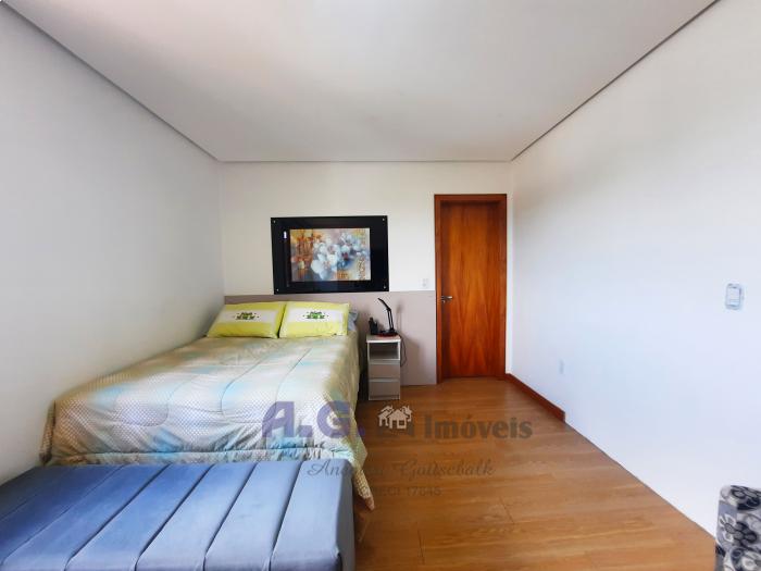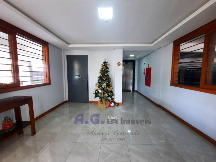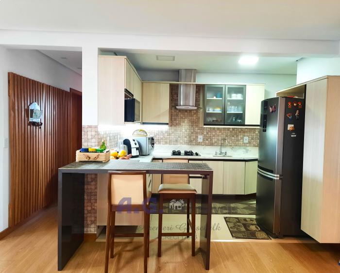 O imóvel conta com a seguinte distribuição: dois dormitórios (um deles suíte), sala de estar e jantar integrados, cozinha com churrasqueira, área de serviços, banheiro social e duas vagas de garagem.