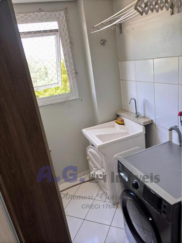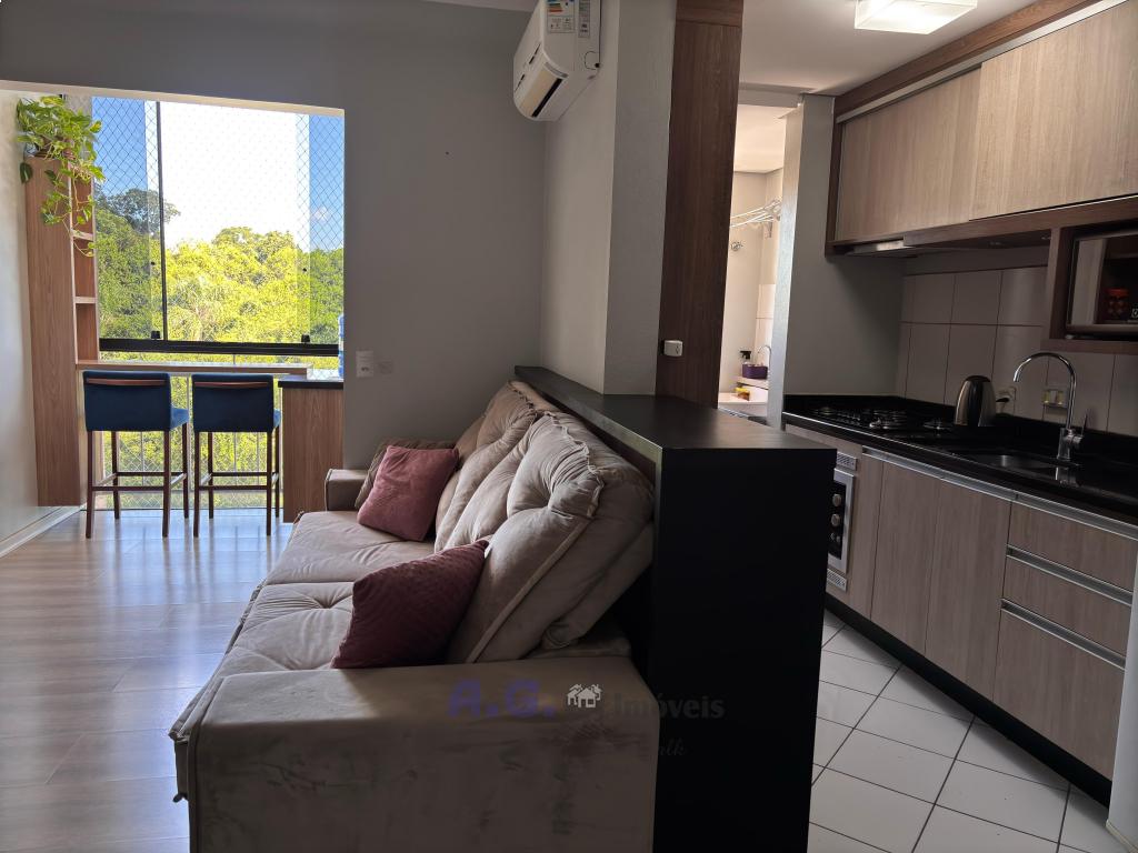 Cozinha semi mobiliada, três dormitórios, banheiro, área de serviço, sacada aberta, uma vaga de garagem, quinto andar, permanecem no apto: móveis sob medida na cozinha, cooktop, mesa com cadeiras e ar condicionado na sala.